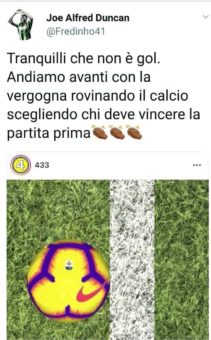 “Tranquilli che non è gol. Andiamo avanti con la vergogna rovinando il calcio e scegliendo chi deve vincere la partita prima”.