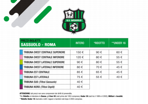 In vista della partita che vedrà contro Sassuolo e Roma al Mapei Stadium, i neroverdi sul proprio sito hanno comunicato le modalità di acquisto e i prezzi dei biglietti. Il settore ospiti sarà accessibile anche ai non possessori della tessera del tifoso al prezzo di 40 euro. Di seguito il comunicato ufficiale:
