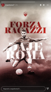 Oggi pomeriggio contro lo Spezia non ci sarà, ma Sergio Oliveira ci tiene a far sentire tutto il suo supporto alla squadra. L’incitamento arriva tramite una stories Instagram dove il portoghese ha scritto: “Forza ragazzi. Daje Roma“. Il centrocampista sarà assente per un problema fisico accusato nelle ultime ore. Con lui ai box anche Felix, mentre a sorpresa ha recuperato Roger Ibanez.