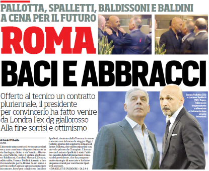Corriere dello Sport (G.D’Ubaldo) – L’incontro tanto atteso si è consumato ieri sera, una cena in un elegante ristorante in via Sardegna, dietro a via Veneto. Al tavolo, con Pallotta, tutto il vertice giallorosso: Baldissoni, Gandini, Massara, Zecca e, udite udite, Franco Baldini, tornato a fare il consulente per la Roma da un anno e arrivato nella Capitale appositamente per incontrare, forse per convincere Luciano Spalletti, rientrato dalla Toscana in serata e ancora con la borsa da viaggio. Oggi è l’ultimo giorno del soggiorno romano di James Pallotta, che stasera ripartirà con un volo privato da Ciampino. L’incontro con Luciano Spalletti è stato l’ultimo tassello della full immersion romana del presidente, che ha programmato strategie di mercato, preso atto dell’accelerazione per la rimozione delle barriere e dei tempi ristretti per uscire dall’impasse dello stadio di Tor di Valle. E che ha fatto un passo avanti per convincere Spalletti a restare.