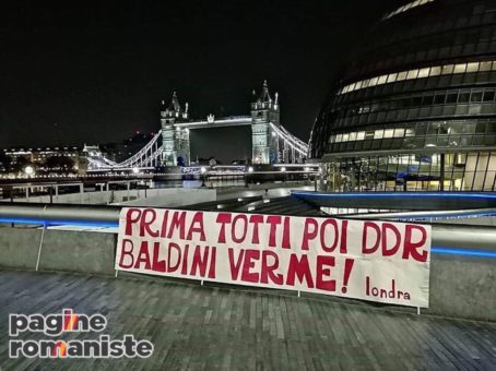 Non solo a Trigoria, ma anche a Londra i tifosi della Roma fanno sentire il loro disappunto sulle questione De Rossi. Tra le strade inglesi è apparso nella notte uno striscione, che ha come bersaglio la società. “Prima Totti poi DDR, Baldini verme”. Il chiaro riferimento è al dirigente e alla sua volontà di non aver voluto proseguire il rapporto calcistico coi due capitani.