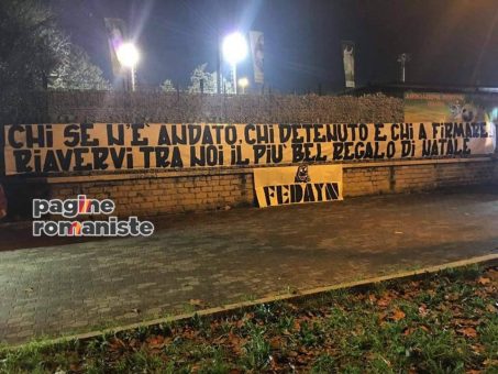 Pagine Romaniste – I Fedayn tornano a farsi sentire prima di Roma-Chievo. Lo storico gruppo della Curva Sud ha esposto uno striscione a Piazza Mancini che recita: “Chi se n’è andato, chi è detenuto e chi a firmare. Riavervi tra noi il più bel regalo di Natale“.
