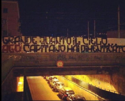 I tifosi della Roma ricordano Agostino Di Bartolomei. Nella notte, nei pressi del Ponte degli Annibaldi, alcuni supporters giallorossi hanno appeso uno striscione con la scritta: “Grande quanto il cielo… Ago capitano mai dimenticato” in memoria del capitano del secondo scudetto, scomparso esattamente 24 anni fa.