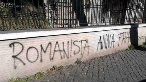 Ennesimo episodio di odio antisemita che vede coinvolta la Capitale: dopo le figurine del 22 ottobre 2017 raffiguranti il volto di Anna Frank con la maglia della Roma, questa volta il riferimento si è ripetuto su un muro nei pressi del Circo Massimo. “Romanista Anna Frank” recita il graffito, completato – come riporta repubblica.it – con il simbolo della svastica nazista e la firma, che rimanda ad un gruppo di tifosi della Lazio. Immediata la rimozione, così come l’indignazione della sindaca Virginia Raggi, che affida a Twitter le sue riflessioni: