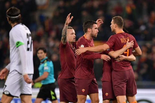 Roma da schiaffi per tutto il primo tempo in cui, dopo una mezza occasione di El Shaarawy in avvio, domina il Cesena: un palo esterno di Kone e due paratone di Alisson su Rodriguez tirano fuori ai 26mila fedelissimi del mercoledì sera sonori fischi all’intervallo. Dopo essere stato costretto a buttare dentro Dzeko al 21’ (noie muscolari per Perotti) il tecnico romanista ridisegna ulteriormente la squadra prima di iniziare la ripresa: dentro Nainggolan per Juan Jesus, difesa a 4 e approccio finalmente più deciso. Dopo tre occasioni mancate dal bosniaco è proprio una combinazione verticale tra i due, al minuto 68, a stappare la partita: assist del «Ninja» e nuovo timbro stagionale di Dzeko. Pare fatta, ma un pasticcio Alisson-Manolas regala a Garritano la palla dell’1-1 a porta vuota e il fantasma dello Spezia inizia a materializzarsi. Sarà solo un fischio galeotto a tempo scaduto, per un contatto veniale tra Agliardi e Strootman, a scacciare la paura, ma il Cesena non meritava davvero di perdere così.