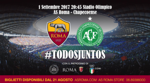 Venerdì 1 settembre, la Roma ospiterà allo Stadio Olimpico la Chapecoense, in un match amichevole organizzato dal club giallorosso, con il patrocinio del Pontifico Consiglio della Cultura, di Roma Capitale e del Coni.