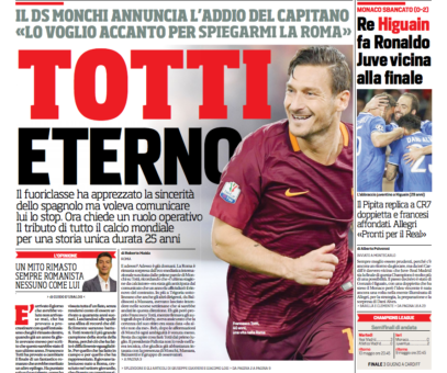 Corriere dello Sport (G.D’Ubaldo) – Monchi apre una nuova era nella Roma e chiude quella di Francesco Totti. Il nuovo direttore sportivo ha annunciato che questa sarà l’ultima stagione da calciatore del capitano, che chiude dopo venticinque anni vissuti tutti con la maglia giallorossa. La decisione della società era chiara da tempo, da almeno un anno, quando, all’annuncio del rinnovo dell’ultimo contratto, con un comunicato fu specificato che questa sarebbe stata la sua ultima stagione. Ieri mattina, prima dell’allenamento, Monchi aveva parlato con Totti, informandolo che avrebbe dichiarato che questa è la sua ultima stagione da calciatore. Francesco ha apprezzato la lealtà dello spagnolo, ma è rimasto male. Sapeva quali fossero le intenzioni della società e avrebbe voluto essere lui a dare l’annuncio del suo addio. Non lo aveva ancora fatto perché ha coltivato fino all’ultimo la speranza che magari, con un altro allenatore, avrebbe avuto la possibilità di chiudere in modo più dignitoso. La passione per il calcio è rimasta intatta. Oggi, con la frase di Monchi nel giorno della sua presentazione ufficiale, c’è un dato certo: la Roma non intende proporgli il rinnovo del contratto. Una decisione che parte da lontano, tra Boston e Londra e dall’incontro tra Spalletti e Pallotta a Miami, nel gennaio dello scorso anno. Il futuro era scritto e Francesco ha sperato fino all’ultimo di ribaltarlo. Spalletti il 19 febbraio dichiarò che sarebbe rimasto solo se avessero rifatto il contratto a Totti. Una provocazione, ma ora non ci sono più alibi.
