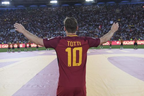 Tra la prima partita con la Roma (campionato Giovanissimi Romani, Roma-Almas 2-0 del 15 ottobre 1989) e il match con il Genoa di ieri 28 maggio 2017, Totti ha abbattuto ogni genere di record societario, conquistando l’affetto e l’ammirazione di tifosi romanisti e appassionati di calcio di ogni parte del mondo, uno Scudetto, due edizioni della Supercoppa di Lega, altrettante edizioni della Coppa Italia e una Coppa del Mondo FIFA nel 2006. Tra le affermazioni personali di maggiore prestigio, la Scarpa d’Oro di miglior realizzatore europeo per la stagione 2006/2007 e il Golden Foot Award nel 2010. Ai 250 gol realizzati in Serie A – secondo di sempre, nessuno mai così prolifico con una sola maglia – Totti aggiunge un posto sul podio nella classifica delle presenze nel massimo campionato.
