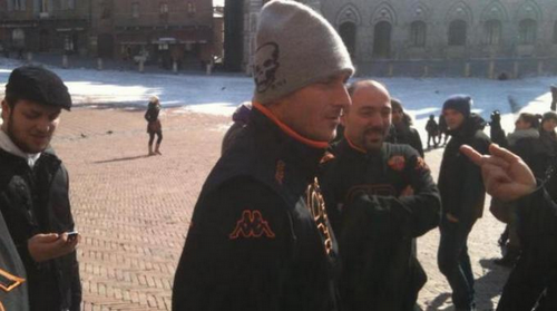 I giocatori della Roma, che stasera affronteranno il Siena al ‘Franchi’ (ore 20,45) alle 11,30 si sono intrattenuti in Piazza del Campo attirando l’attenzione di tanti senesi appassionati di calcio. A calamitare l’attenzione è stato in modo particolare il capitano della ‘Magica’ Francesco Totti. Il giocatore ha firmato autografi insieme ad altri compagni di squadra.