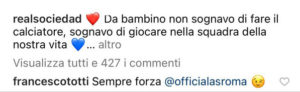 Francesco Totti risponde commentando la vignetta della Real Sociedad raffigurante lui e Xabi Prieto, le due iconiche bandiere dei rispettivi club. Questa sera scenderanno in campo, sul prato dell’Olimpico e si daranno battaglia, la Roma e la Real Sociedad. L’ex capitano giallorosso, omaggiato come esempio di fedeltà dalla scritta degli spagnoli: “Da bambino non sognavo di fare il calciatore, sognavo di giocare nella squadra della nostra vita”, risponde con un diretto “Sempre forza Roma”.