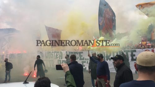 Pagine Romaniste (da Trigoria E.Bandini) – E’ arrivato il momento della partita più importante dell’anno per la Roma e i tifosi, come sempre, non hanno fatto mancare il loro supporto. In tantissimi (circa un migliaio) si sono presentati a Trigoria per salutare e caricare la squadra in partenza verso Manchester dove domani sera (ore 21 ad Old Trafford) sfiderà lo United nell’andata della semifinale di Europa League. Cori per incitare i giallorossi e contro Manchester per dare ancora una carica ulteriore. Prima dell’uscita della squadra anche un grande abbraccio a Bruno Conti che si è palesato al di fuori del Centro Sportivo. Anche uno striscione da parte dei tantissimi presenti: “Anche se non sentirete la nostra voce, guardate la lupa che avete sul petto, Roma è con voi! Curva Sud“. Al tutto hanno assistito anche alcuni giocatori della Primavera. Dalla terrazza di Trigoria si sono affacciati Mancini, Spinazzola, El Shaarawy, Pellegrini, Cristante, Veretout, Dzeko.