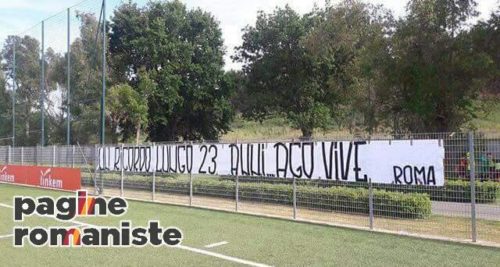 Questo pomeriggio alcuni tifosi della Roma in occasione della terza edizione del Torneo Agostino Di Bartolomei hanno affisso uno striscione proprio per la bandiera giallorossa. Queste le parole dello striscione: