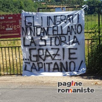 Pagine Romaniste – Questa mattina fuori dai cancelli di Trigoria alcuni tifosi giallorossi hanno appeso uno striscione per Francesco Totti. La società giallorossa però l’ha fatto rimuovere poco dopo che era stato affisso fuori dal centro sportivo. Questo il testo dello striscione: