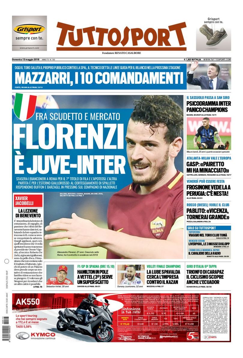 “Florenzi, è Juve-Inter“. Nonostante sia in programma la gara tra Roma e Juventus, TuttoSport dedica la prima pagina ad uno ‘scontro’ di mercato tra i bianconeri e i nerazzurri. I due club sono interessati ad Alessandro Florenzi, esterno giallorosso col contratto in scadenza a giugno 2019. Questo quanto riferisce il quotidiano: “al corteggiamento di Spalletti rispondono Buffon e Barzagli, in pressing sul compagno di Nazionale“.