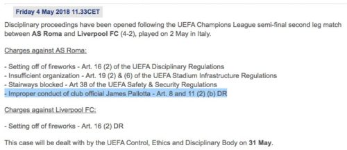 Oltre che per Pallotta la Uefa ne ha anche per la Roma. Il massimo organo europeo ha aperto un procedimento disciplinare contro la Roma per “organizzazione insufficiente“. Inoltre c’è un procedimento per lancio di petardi e per le scale bloccate. Indagato anche il Liverpool per lancio di petardi.
