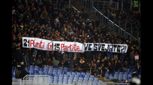 La contestazione annunciata ieri dalla Curva Sud ha squarciato il cielo di un Olimpico mai così vuoto quest’anno. Nel mirino Pallotta, la dirigenza e la squadra. Atmosfera strana, quasi surreale, come se in una fredda serata di dicembre fossero venute al pettine tutte le diffidenze di un rapporto mai decollato tra la Roma americana e lo zoccolo duro dei tifosi. La protesta era stata annunciata in mattinata da un dettagliato comunicato della Curva Sud, che ripercorreva i motivi della sfiducia: “ Senza dare alibi a nessuno sia chiaro, ma l’incapacità di fare il proprio mestiere di Presidente e società hanno fatto sì che la Roma anno dopo anno cedesse sempre qualcuno dei suoi pezzi migliori, sostituiti spesso e volentieri con giocatori di minor valore, indebolendo la rosa, navigando a vista con acquisti il più delle volte inadatti. Noi non possiamo più sopportare questo modus operandi, bugie dannose da parte di chi dovrebbe essere trasparente verso i propri tifosi”. Lo scrive il Corriere dello Sport.