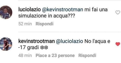 Botta e risposta tra un tifoso della Lazio e Kevin Strooman sul profilo Instagram dell’olandese. Sotto ad una foto che ritrae il centrocampista in vacanza un tifoso biancoceleste ha scritto: “Mi fai una simulazione in acqua?“, la risposta del numero 6 non si è fatta attendere: “No, l’acqua è a -17 gradi“, alludendo alla differenza di punti tra la Roma e i cugini in classifica.