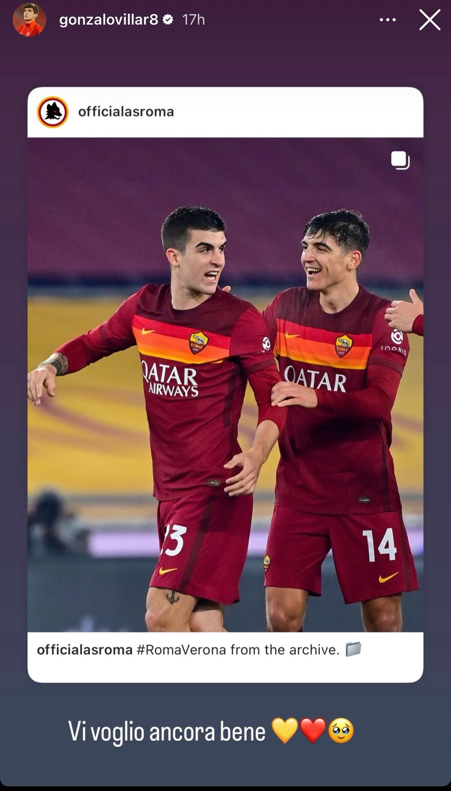 Gonzalo Villar non si è dimenticato della sua avventura nella Capitale. In vista del prossimo impegno di campionato contro l’Hellas Verona, lo spagnolo in forza al Granada ha prima ricondiviso sul proprio profilo social una storia del profilo ufficiale della Roma, nella quale è raffigurato proprio l’ex numero 14 in compagnia di Mancini; il tutto, accompagnato dalla didascalia: “Vi voglio ancora bene”, con tanto di cuore giallo e rosso, cui si aggiunge l’emoji emozionata e quasi in lacrime.