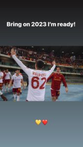 È ufficialmente iniziato il nuovo anno e i giocatori continuano a festeggiare. Tra questi c’è anche Cristian Volpato. Il fantasista giallorosso ha vissuto un 2022 assolutamente positivo con la definitiva consacrazione in prima squadra dopo essere cresciuto nella Primavera. Il classe 2002 ha anche trovato le prime reti con la maglia della Roma, entrambe contro l’Hellas Verona. Il giovane talento ha pubblicato un post per dare la carica in vista del nuovo anno: “Avanti 2023, sono pronto“.