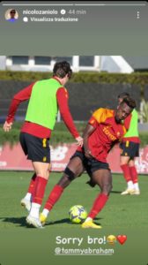 La Roma è tornata questa mattina al lavoro, e tra i più attesi c’erano senza dubbio Tammy Abraham e Nicolo Zaniolo. I due sono stati protagonisti anche su Instagram, dove Zaniolo ha condiviso una foto in cui ha fatto un tunnel all’attaccante inglese. Il classe ’99 si è poi scusato ironicamente con Abraham: “Sorry bro!”.