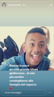 “Riposa in pace piccolo grande tifoso giallorosso. Le mie più sentite condoglianze alla famiglia del ragazzo“.