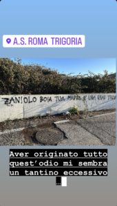 Dopo lo striscione apparso nella notte, Nicolò Zaniolo è stato destinatario di un altro messaggio ingiurioso. Questa volta, il messaggio è stato lasciato nei pressi del centro sportivo di Trigoria. Con una storia su Instagram, la mamma – Francesca Costa – del numero 22 ha così risposto: “Aver originato tutto quest’odio mi sembra un tantino eccessivo…”.