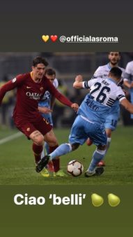 La Roma è in festa. I giallorossi hanno si sono imposti per 2-0 nel derby con le reti di Mkhitaryan e Pedro. Presente sugli spalti dello Stadio Olimpico, Nicolò Zaniolo ha festeggiato il successo nella stracittadina. Il talento della Roma ha postato una storia nella quale gioioso se la ride: “Ciao belli”. Di seguito la foto.